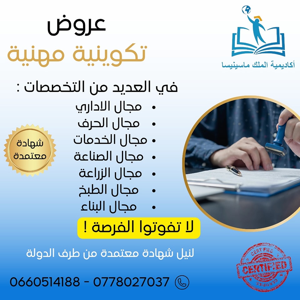 King Massinissa Academy-دورات أكاديمية الملك ماسينيسا عروض تكوينية مهنية تفاصيل أكثر دورة المربية المتميزةعن بعد تفاصيل أكثر دورة الاعلام الالي تفاصيل أكثر دورة الخياطة تفاصيل أكثر دورة المربية المتميزةحضوري تفاصيل أكثر دورة مساعدة ادارية سكرتارية مكتبية تفاصيل أكثر دورة مساعد طبي تفاصيل أكثر دورة مساعد صيدلي تفاصيل أكثر دورة الحلاقة والتجميل تفاصيل أكثر دورة الحجامة الطبية تفاصيل أكثر دورات تعليم اللغات تفاصيل أكثر دورة الحلويات تفاصيل أكثر برنامج الدعم المدرسي المتكامل تفاصيل أكثر التمهيدي والتحضيري تفاصيل أكثر قيد التصميم تفاصيل أكثر قيد التصميم تفاصيل أكثر